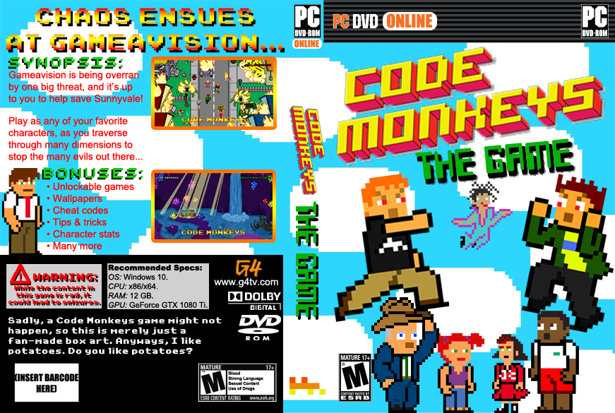 this is a fanmade game box art of the show code monkeys, in the style of it being a computer game (obviously). i really like code monkeys. a lot. it's probably one of my favorite shows of all time. i had originally uploaded this to twitter and instagram a while back, and i'm uploading it here for everyone to see again, because i can.